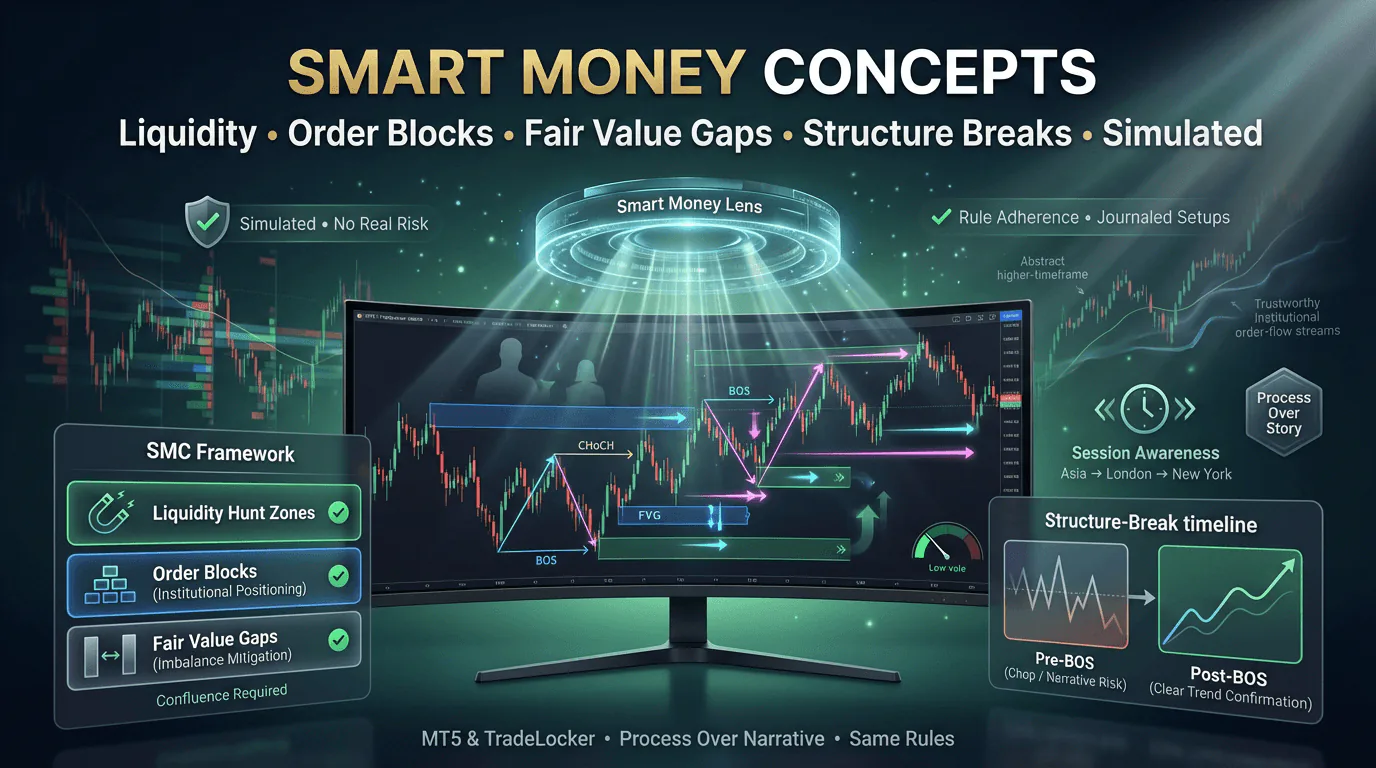 流动性、订单块、市场结构(BOS/CHoCH)、公允价值缺口、交易时段背景,以及如何在不出现过拟合的情况下研究SMC——此外,为何评估仍更关注规则而非叙事。
